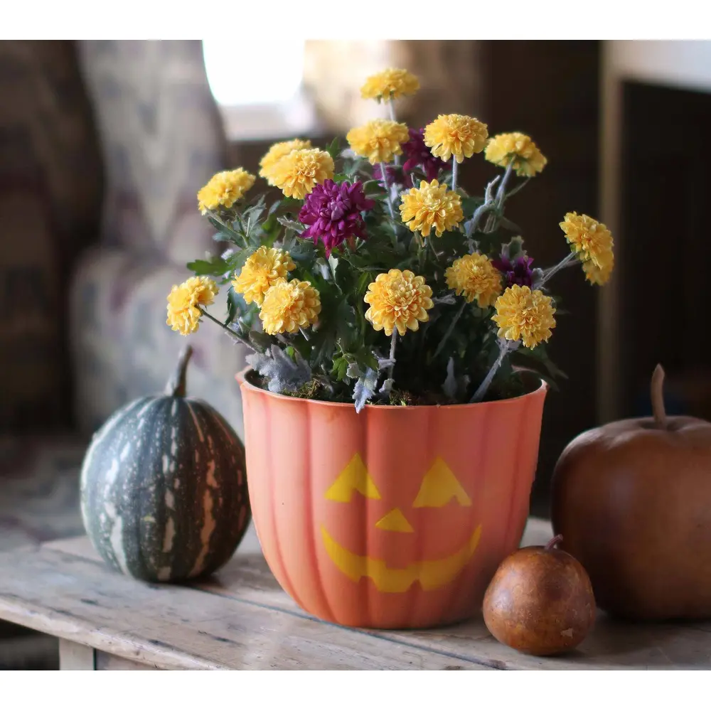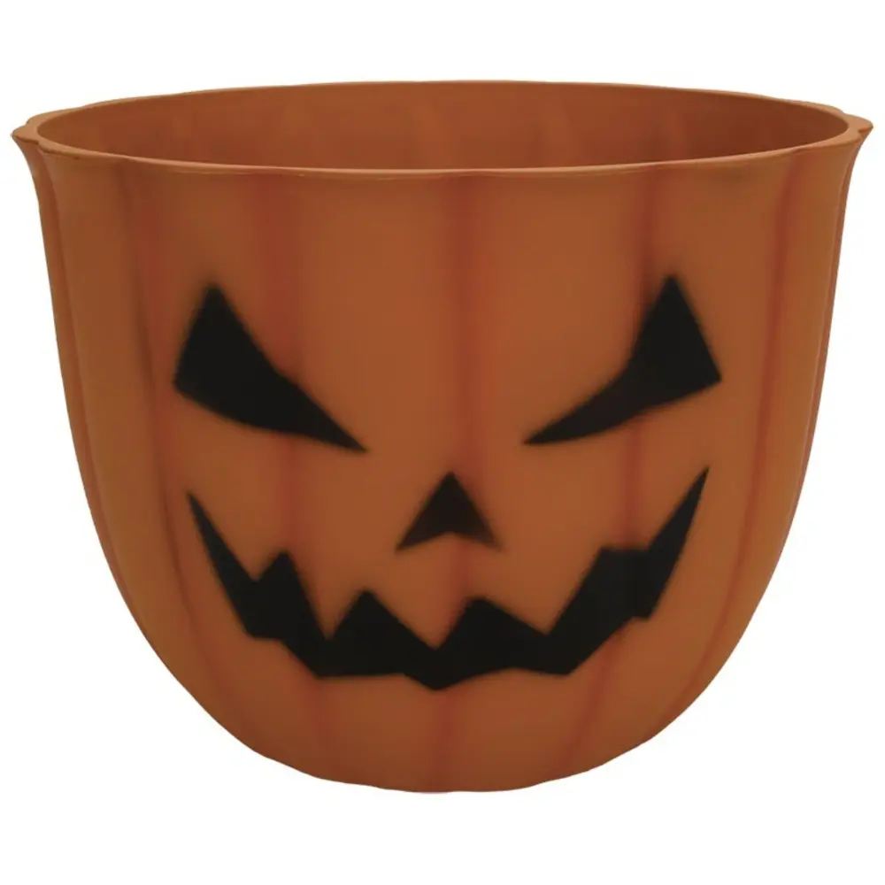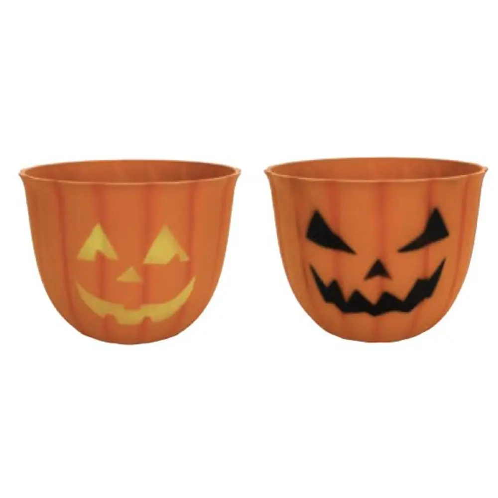 Happy and scary Jack-O-Lantern faces positioned on both sides of the planter. Great for mums or Halloween candy bowls.