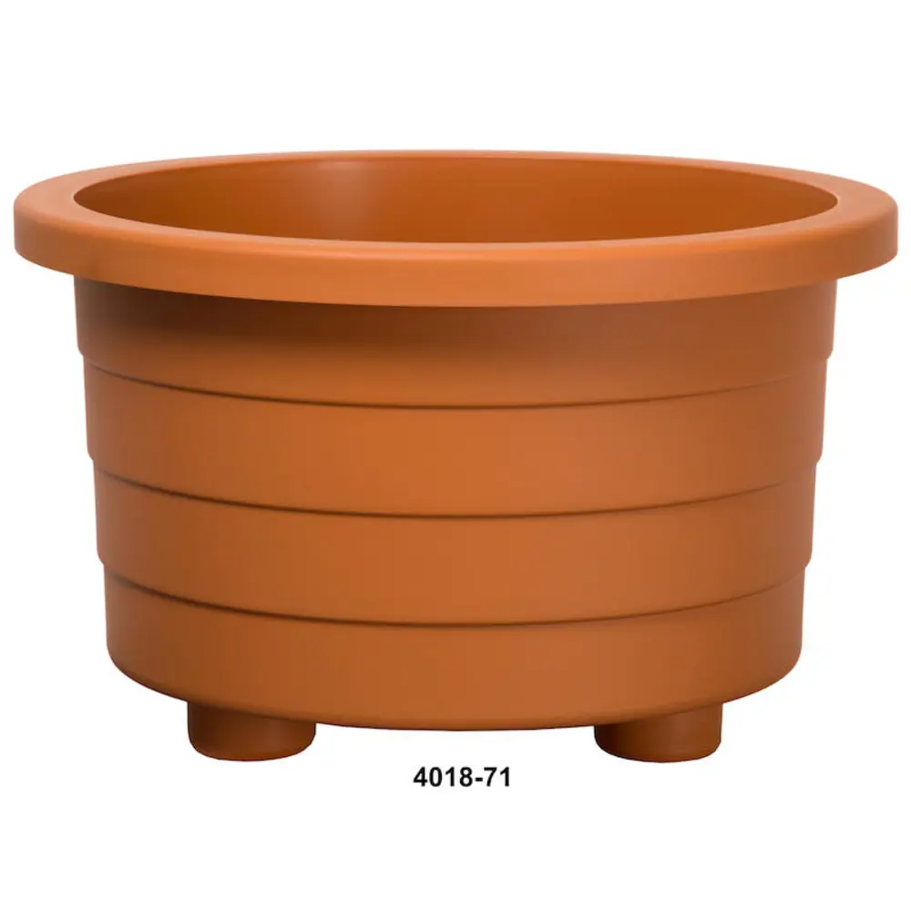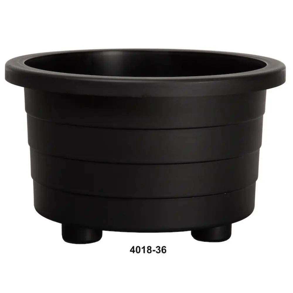 Futura round patio planter with classic design and thick wall. Supplied with a plug for indoor use and a perforated cap for outdoor use. Made in Canada with recyclable and non-toxic thermoplastic, U.V. protected. DCN products are available for fall booking, inventory is restocked once yearly.