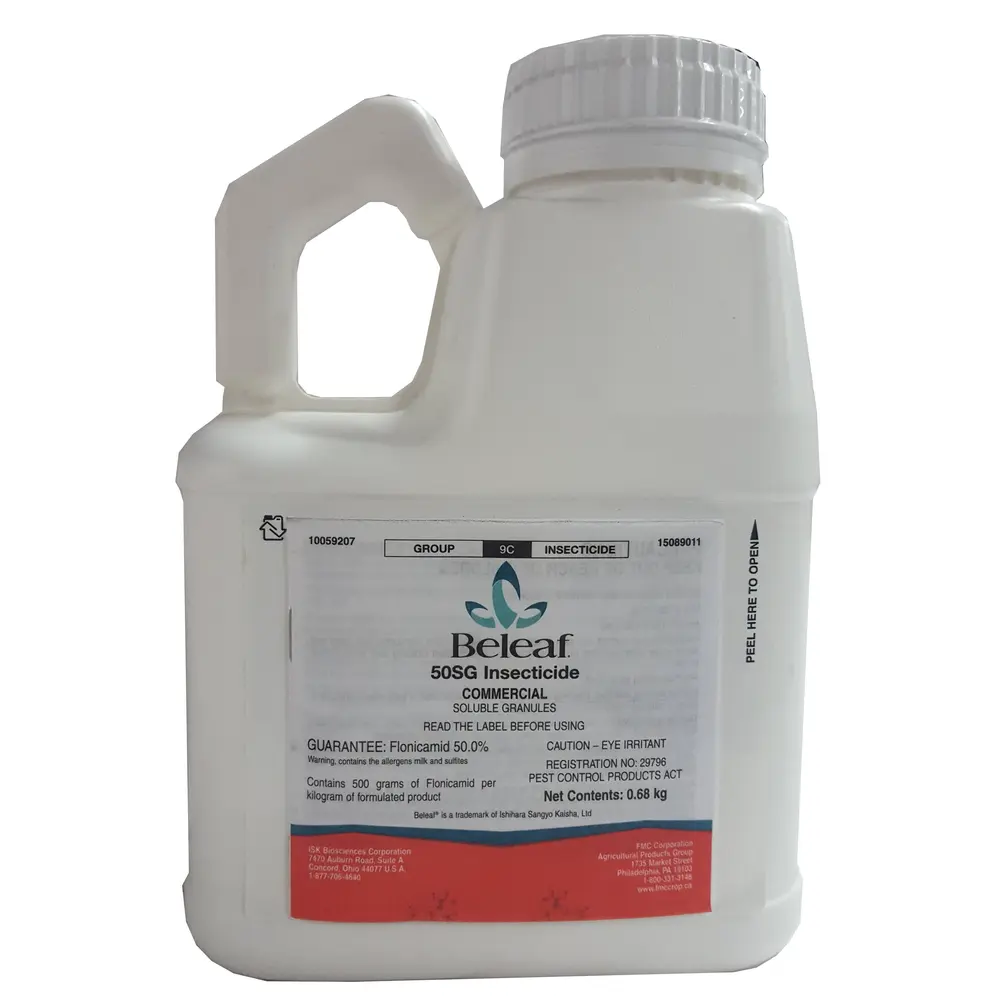 Beleaf 50 SG Insecticide is a 50 percent water dispersible granular formulation of the insecticide flonicamid. Beleaf 50 SG Insecticide controls aphids in Brassica (cole) leafy vegetables, cucurbit vegetables, fruiting vegetables and leafy vegetables (excluding Brassica), hop, tuberous and corm vegetables, root vegetables (excluding sugar beets), pome fruit and stone fruit. Registered for use on Greenhouse and Outdoor Ornamentals, Greenhouse Cucumbers, Peppers and Tomatoes.