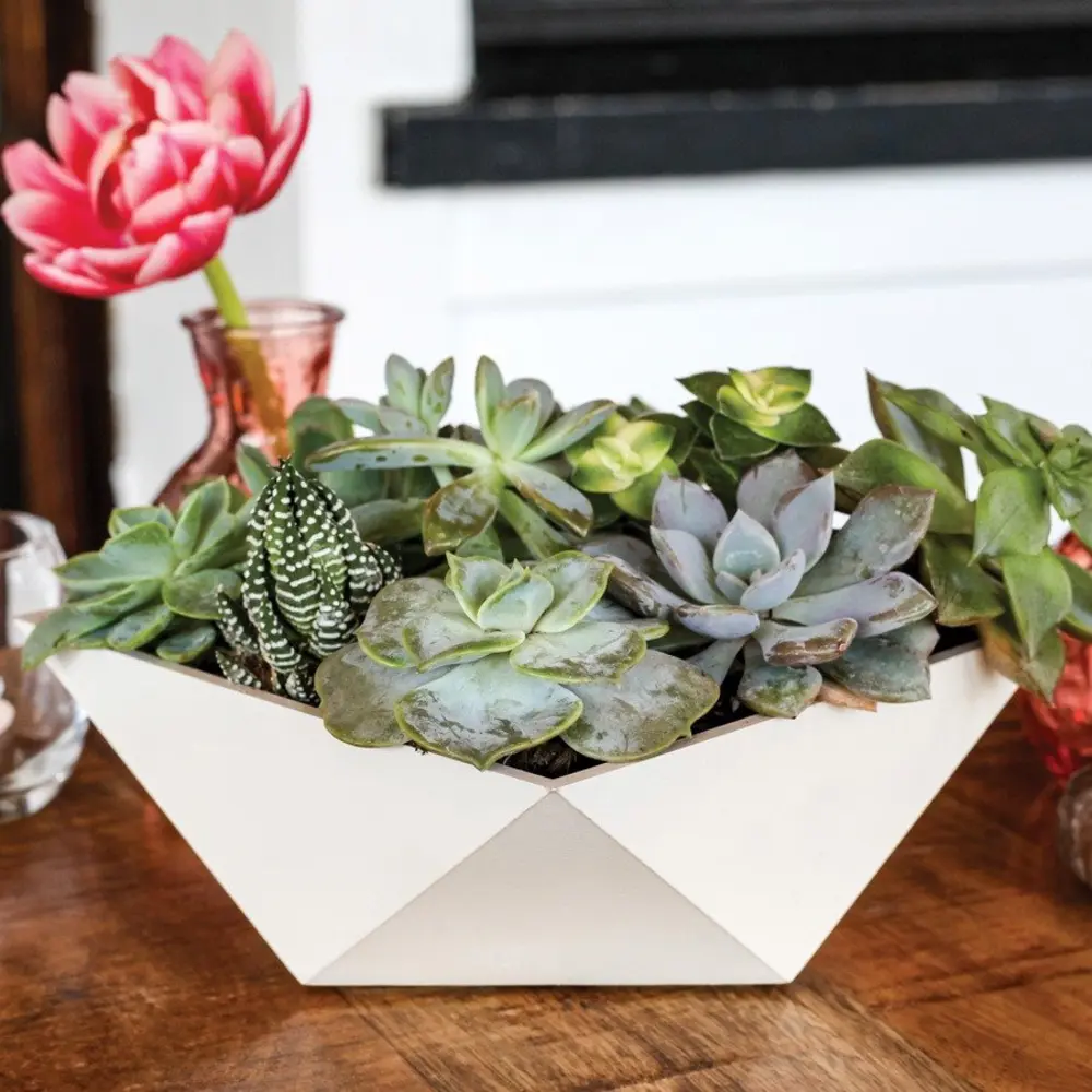 Uniquely designed succulent planter that has the look of ceramic and concrete without the fragility. Features a drainage hole for proper succulent care.