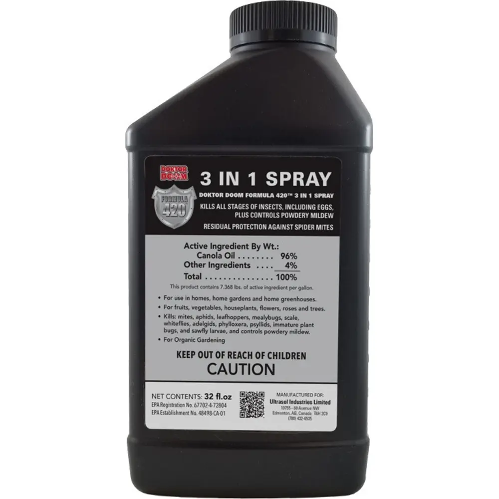 Doktor Doom’s Formula 420 3-in1 Spray Concentrate 1L kills all stages of insects, plus provides powdery mildew control. Residual protection against spider mites. Approved for organic gardening. For use in homes, home gardens and home greenhouses. For fruits, vegetables, houseplants, flowers, roses and trees. Kills: mites, aphids, leafhoppers, mealybugs, scale, whiteflies, adelgids, phylloxera, psyllids, immature plant bugs, and sawfly larvae, and controls powdery mildew. Doktor Doom products are available for fall booking. Inventory is restocked once per year.