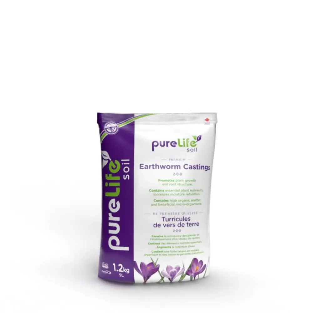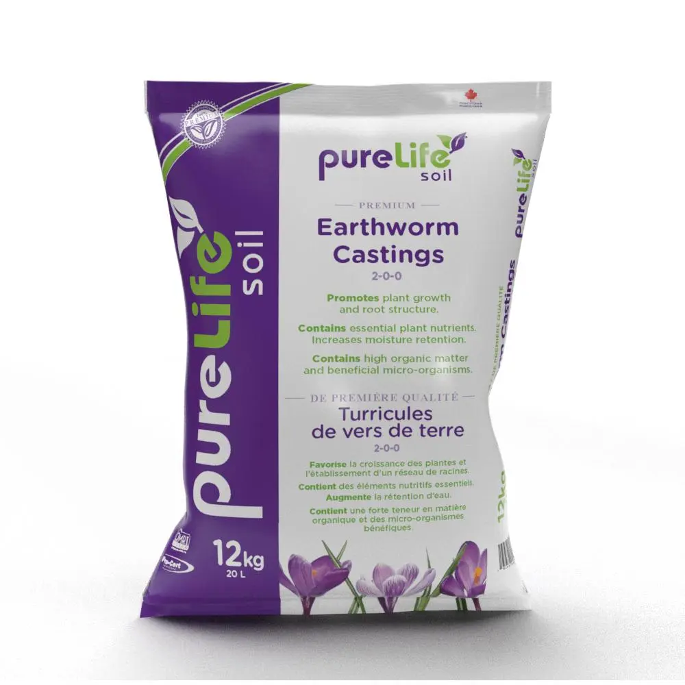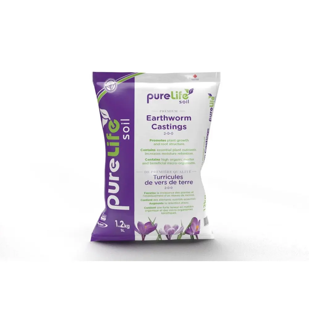 PureLife's premium organic earthworm castings work with your soil to promote plant growth and root structure. Both the 5L and 20L bags contain essential plant nutrients and beneficial micro-organisms which increase moisture retention and optimizes growth. The castings can be used both indoor or outdoor for seed germination, seedling propagation, and on existing plants. We recommend creating a mixture that consists of 80%-85% of existing soil and 15%-20% castings.