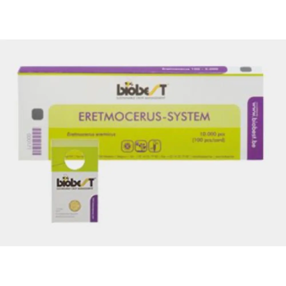 The parasitic wasp Eretmocerus eremicus. Ectoparasitoid that controls whitefly infestations. The female adults are citron yellow, have green eyes with three red dots (the so-called ocelli or simple eyes) and have five antenna segments in total. 100 cards, with 100 pupae per card. Biobest is ordered weekly, and may involve additional shipping charges. Weekly order deadline is Tuesday afternoon, orders are shipped from Saint John the following Tuesday. Shipping typically takes 1-2 days and may be longer for remote locations. Deadline is subject to change on weeks with holidays. Talk to your sales rep for more information.