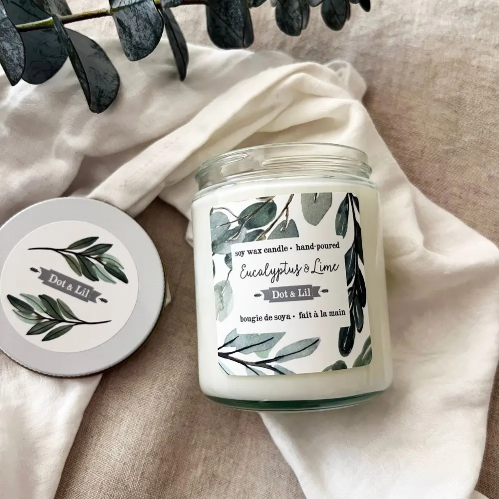 Dot & Lil?s finely hand-poured candles are made with a wax blend of 100% pure soy & botanical oils, with a cotton wick. Each candle is hand-poured in a glass jar with white metal lid, and comes with beautiful patterned box. This 7.2 oz size burns for approximately 45 hours.