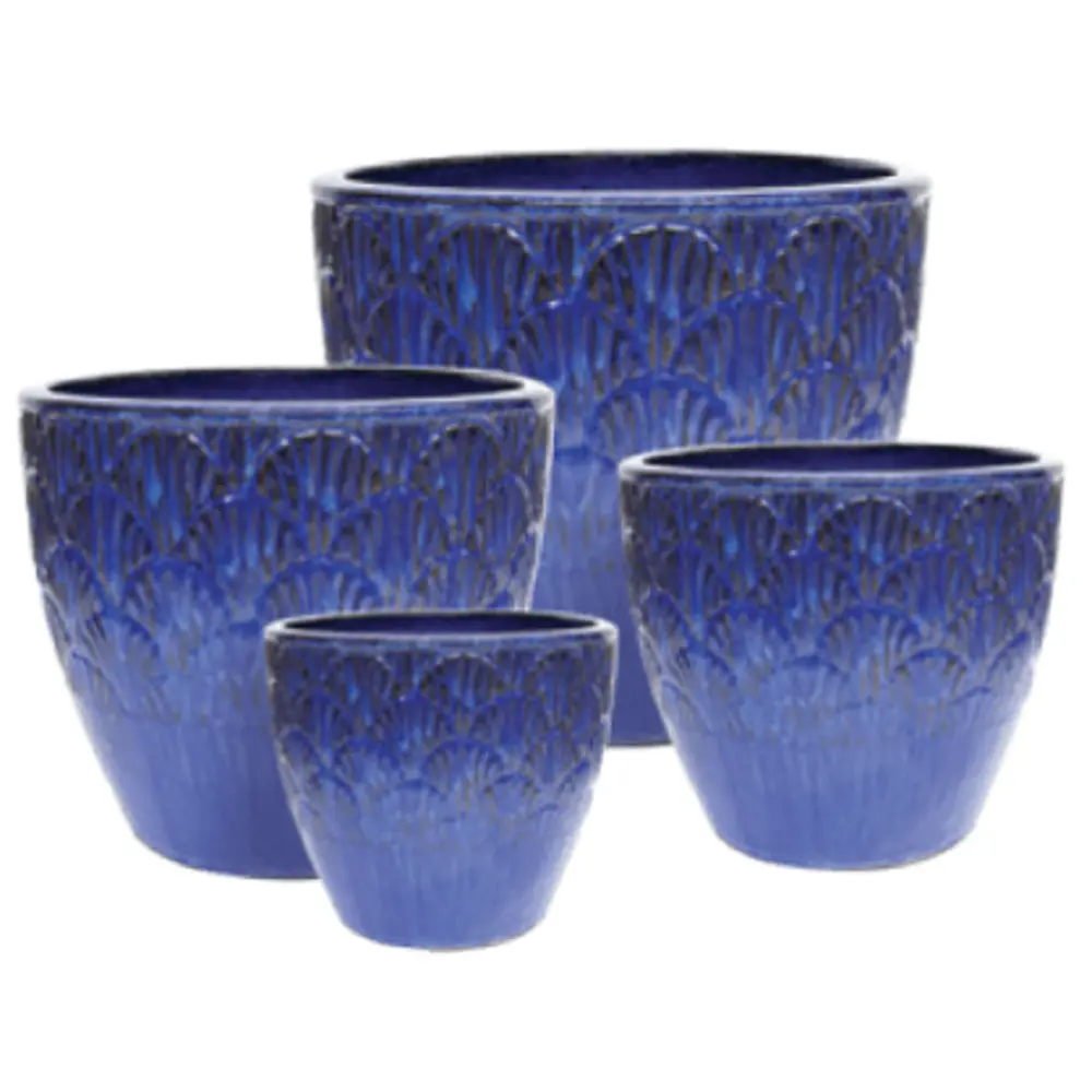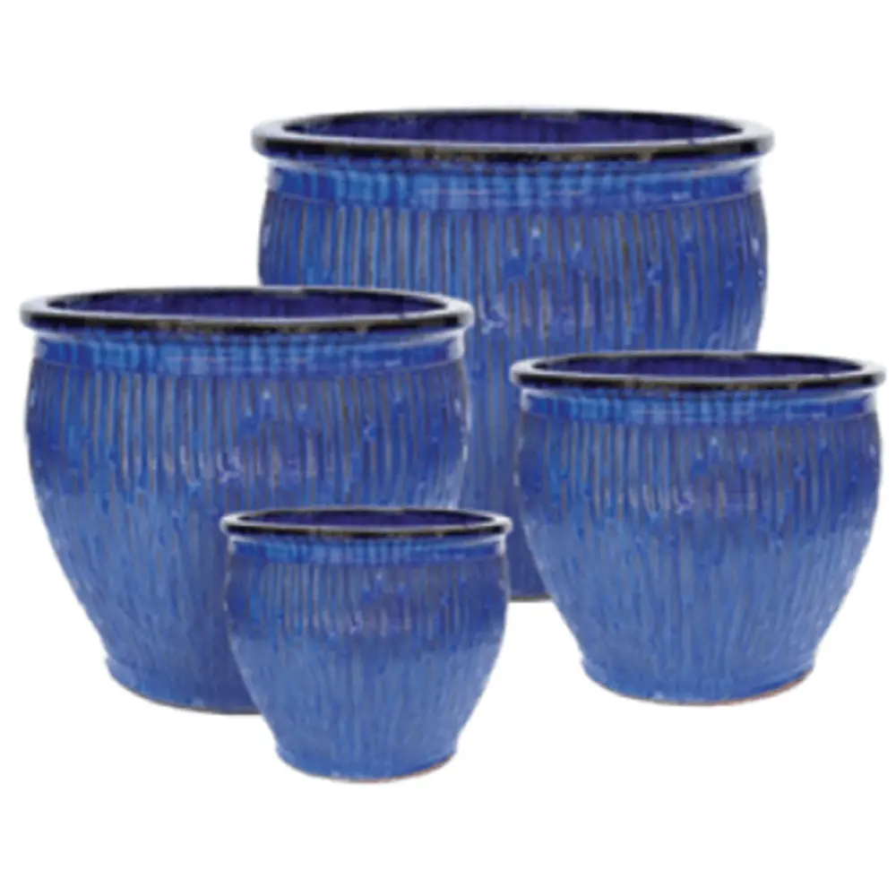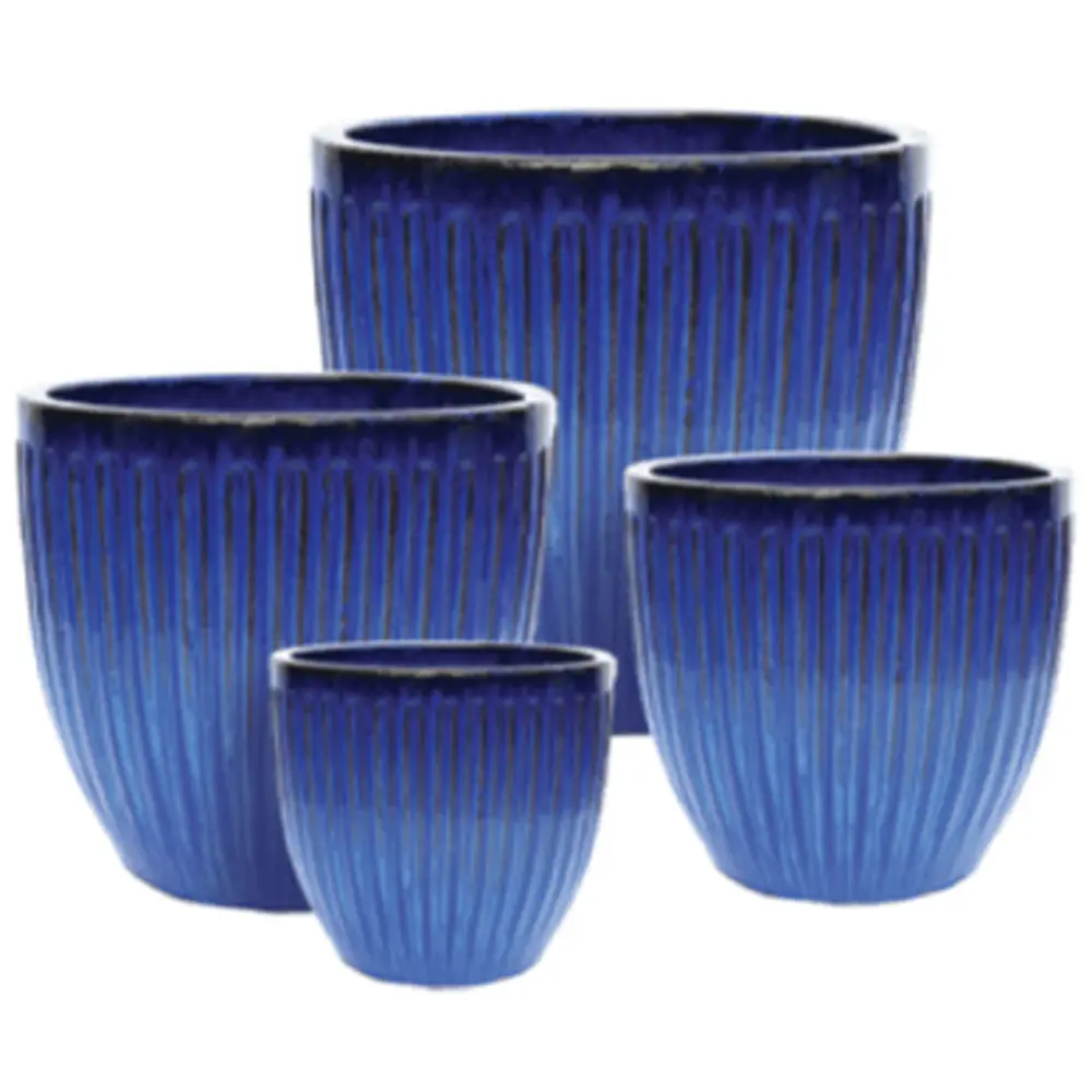 Mixed pallet display of glazed ceramic pots suitable for indoors and outdoors from Jackson Pottery. Each unit contains 40 pieces. Contains an all-blue assortment of Stria, Rain and Bondi planters. Detailed product breakdown with sizes, colours and suggested pricing can be found in the product images.