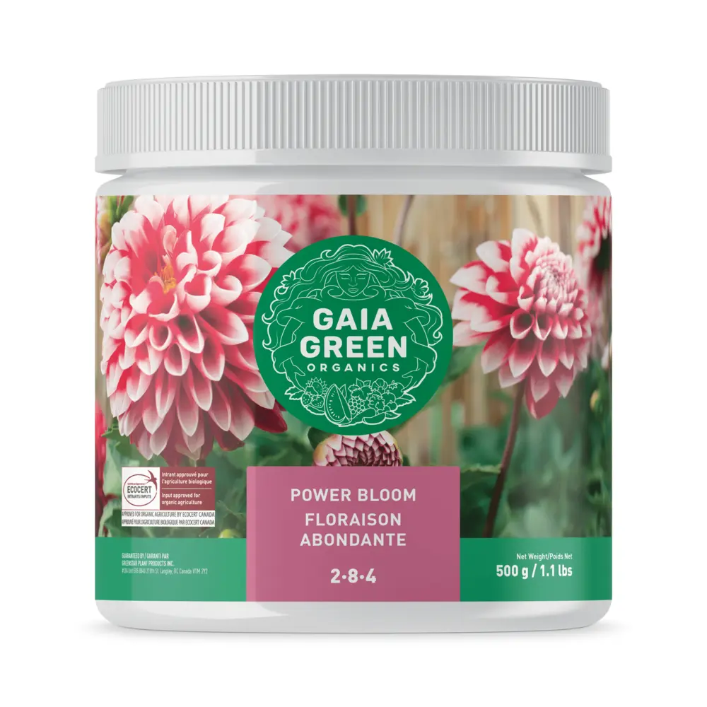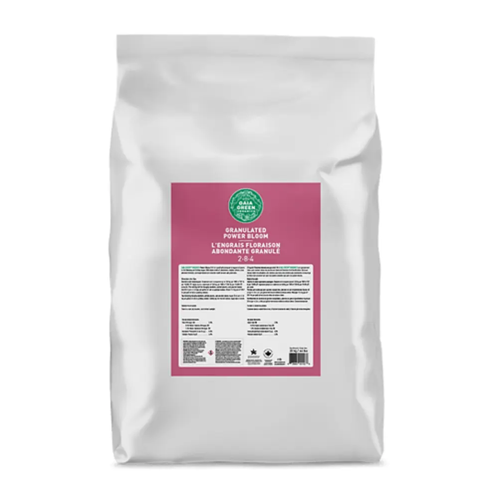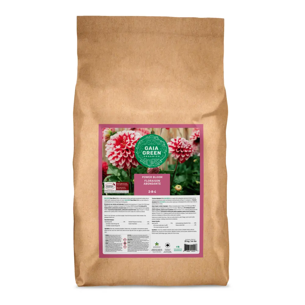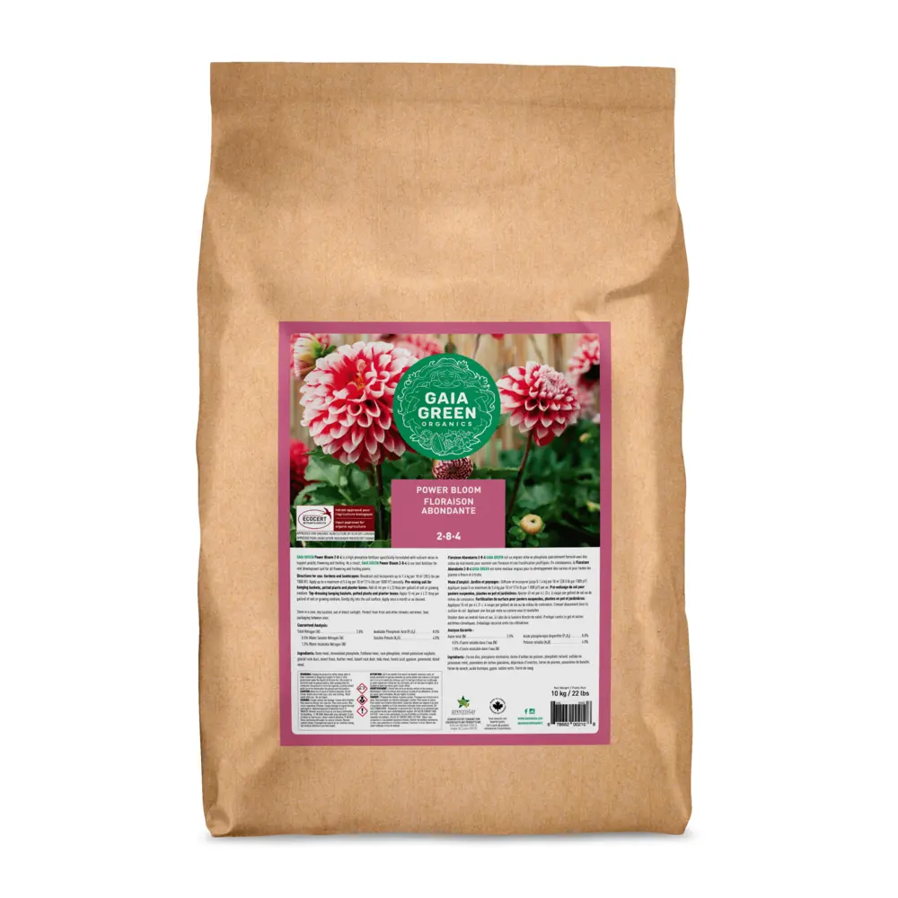 Gaia Green Power Bloom is a high phosphate fertilizer specifically formulated to support prolific flowering and fruiting. As a result, Gaia Green Power Bloom is our best fertilizer for root development and for all flowering and fruiting plants. Available ungranulated, or granulated in a 20kg bag. Gaia Green products are available for fall booking, inventory is restocked once yearly.