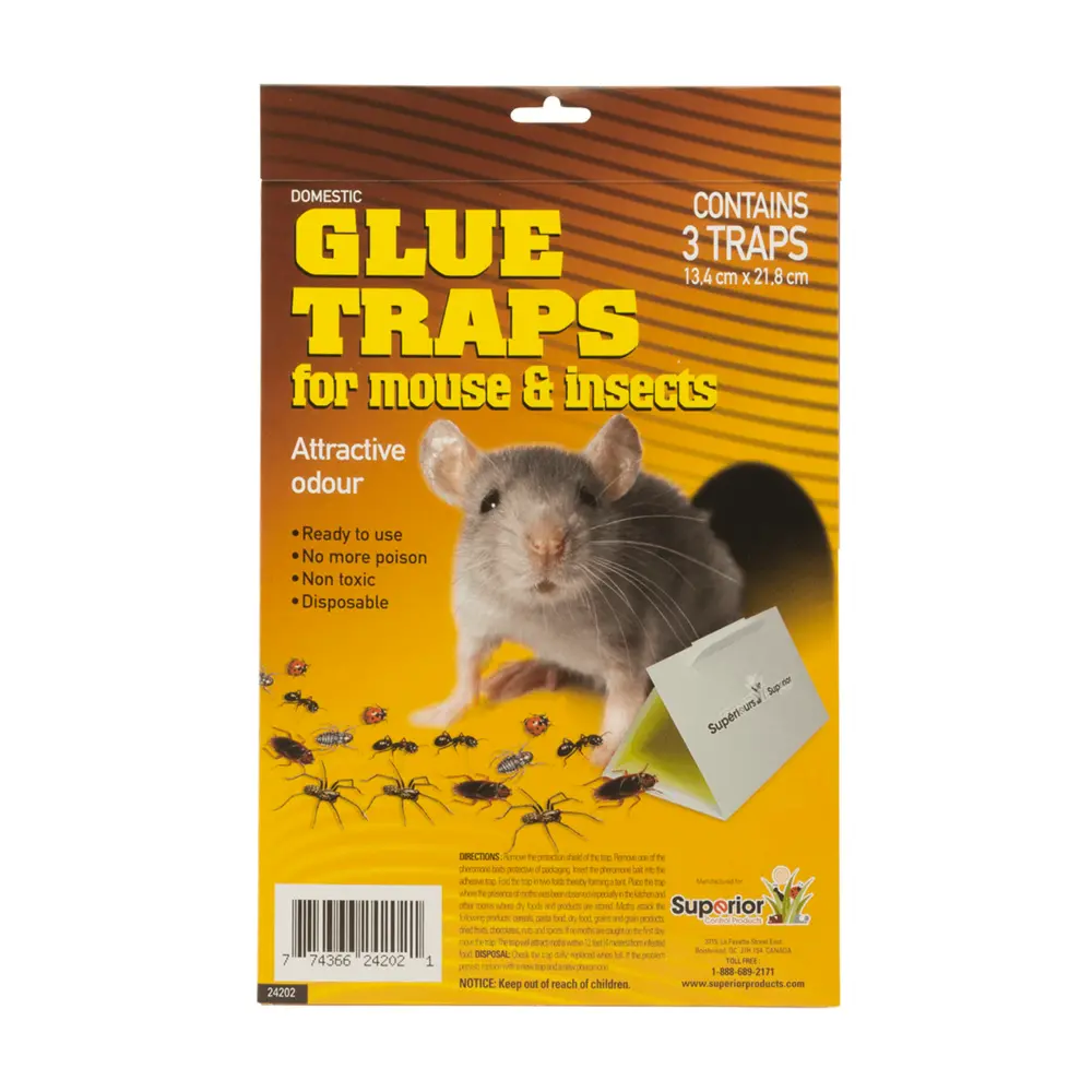 Glue traps for mice or insects. Easy to use. Available in two styles: carton board with 3 traps, or plastic boards with 2 traps.