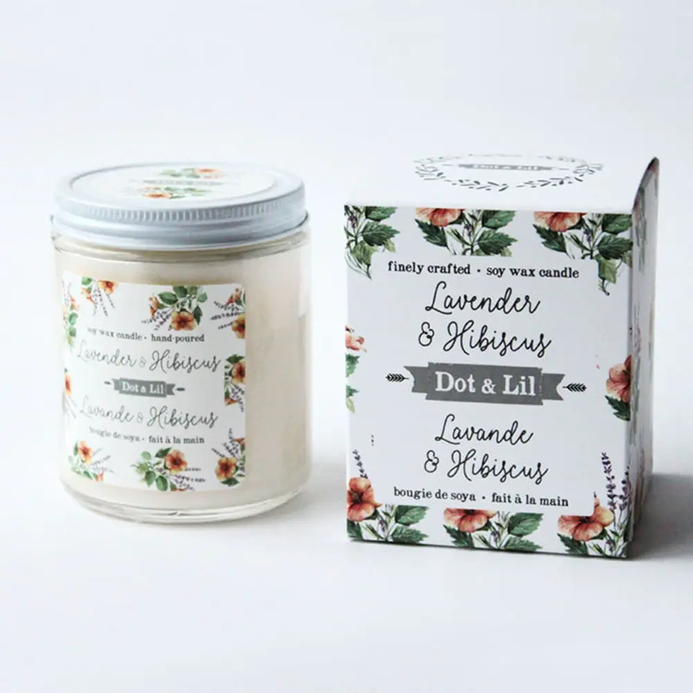Dot & Lil?s finely hand-poured candles are made with a wax blend of 100% pure soy & botanical oils, with a cotton wick. Each candle is hand-poured in a glass jar with white metal lid, and comes with beautiful patterned box. This 7.2 oz size burns for approximately 45 hours.