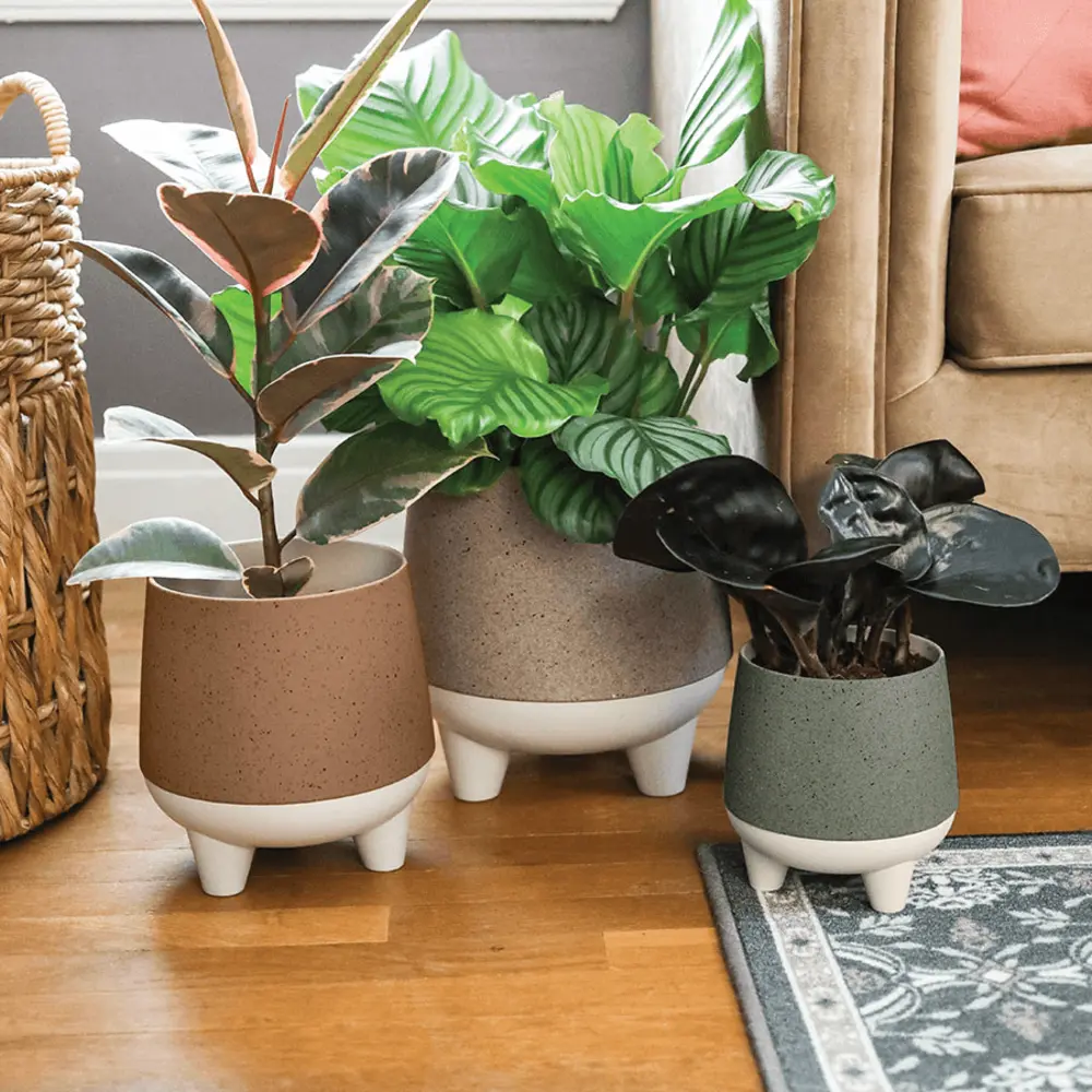 Orion Planter. Self watering two-piece planter. Modern two-toned faux finish planter in current trend colors. Contemporary raised base design. Available in 6", 8" or 10" in a range of colours.