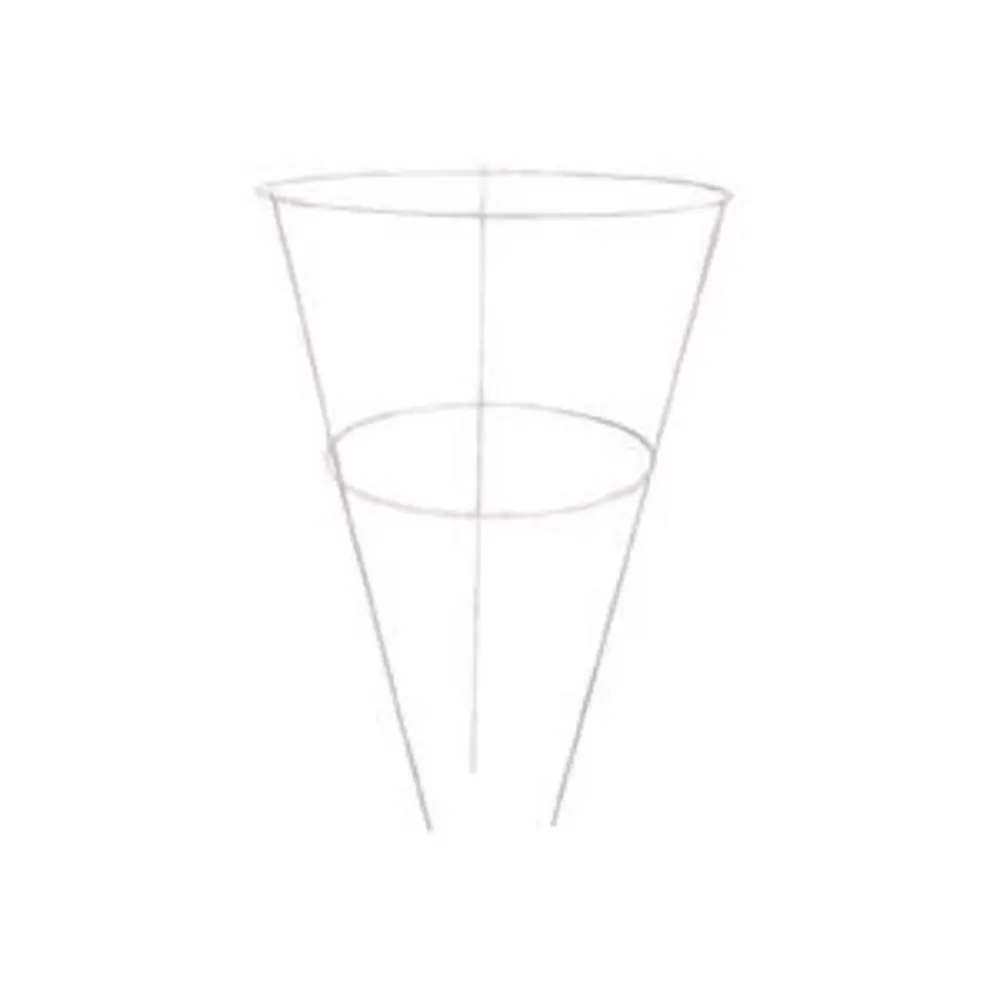 Three legged peony support measuring 30" tall, 18" diameter on the top ring and 13 3/4" diameter on the middle ring.