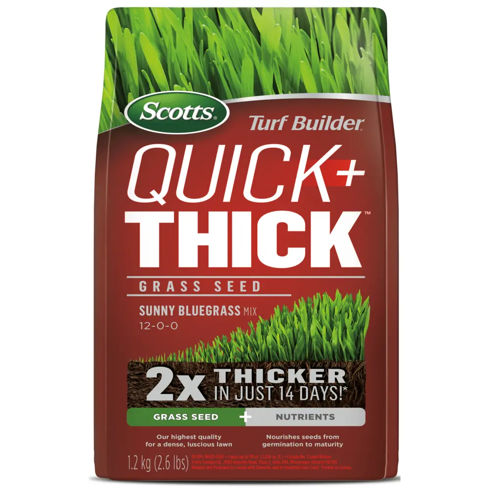 Here’s how to grow a lush lawn in a hurry: Scotts Turf Builder Quick + Thick Grass Seed Bluegrass Sun Mix 12-0-0. Grows grass 2X thicker – in just 14 days! Our exclusive mix contains our highest quality grass seed plus a special blend of slow-release fertilizers. So, seed not only gets a quick start, it grows into thick, green grass that lasts. 99.99% weed-free grass seed made just for sunny areas. Ideal for overseeding existing lawns. Great for establishing a new lawn on bare soil.