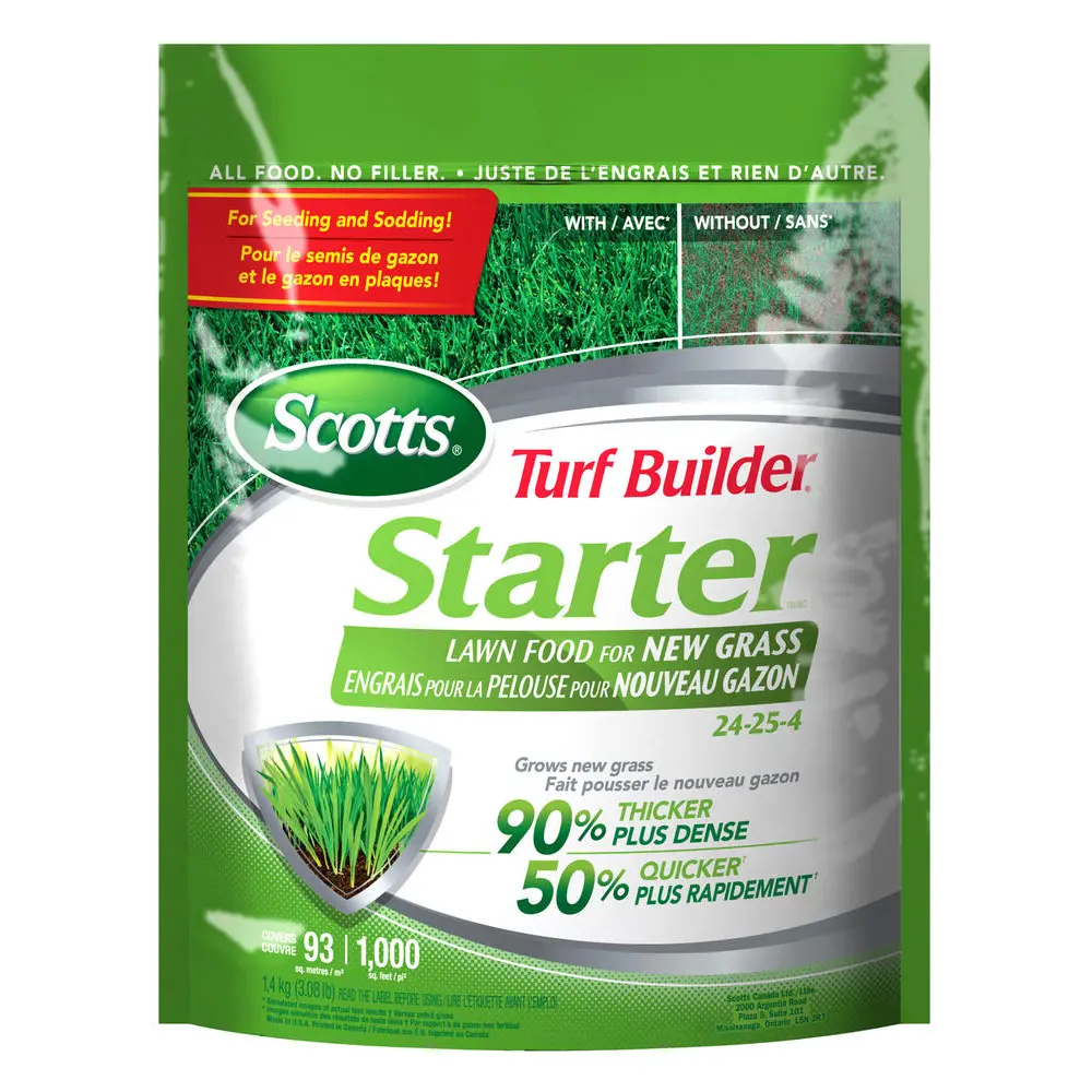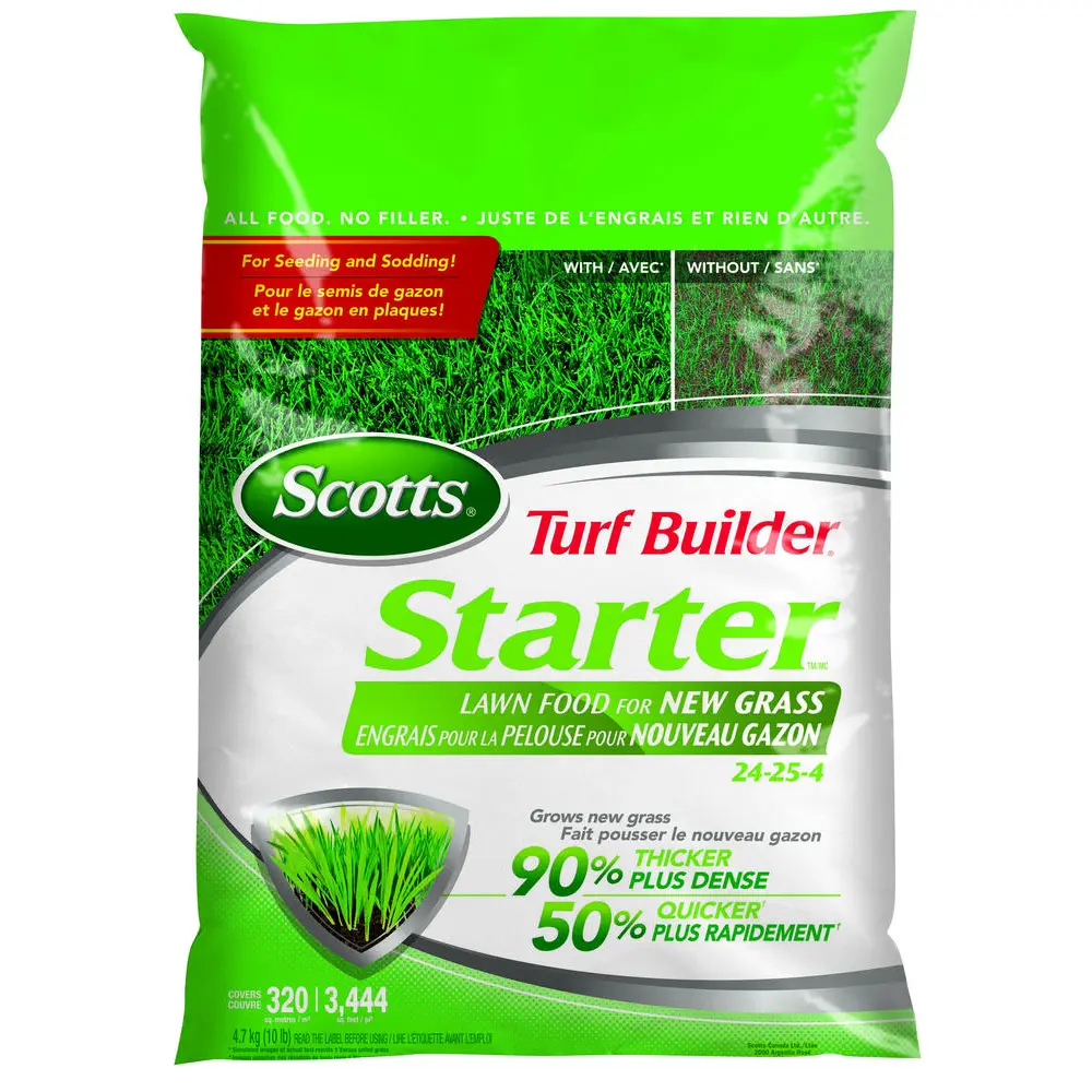 Quickly nurture a newly seeded or sodded lawn with Scotts Turf Builder Starter Lawn Food for New Grass (24-25-4). Its high phosphorus content promotes the strong root system needed for a thick and healthy established lawn. This product can also be used for over-seeding existing lawns.