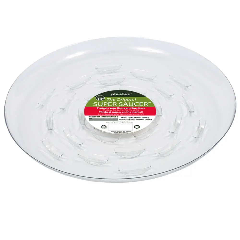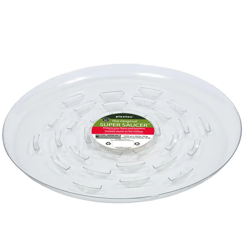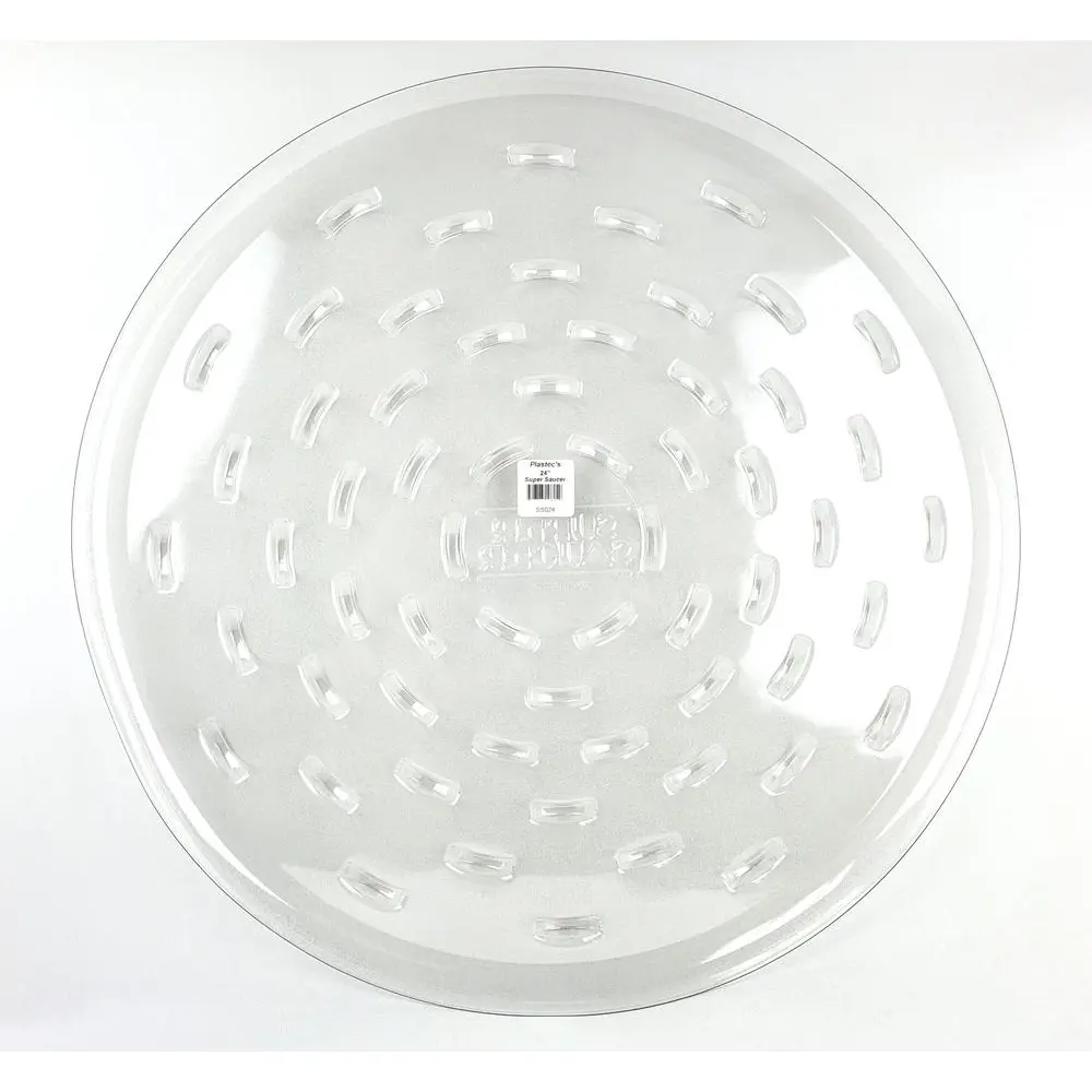 A clear, plastic saucer for under plants. An economical and lightweight way to retain water and protect surfaces. For indoor and outdoor use.