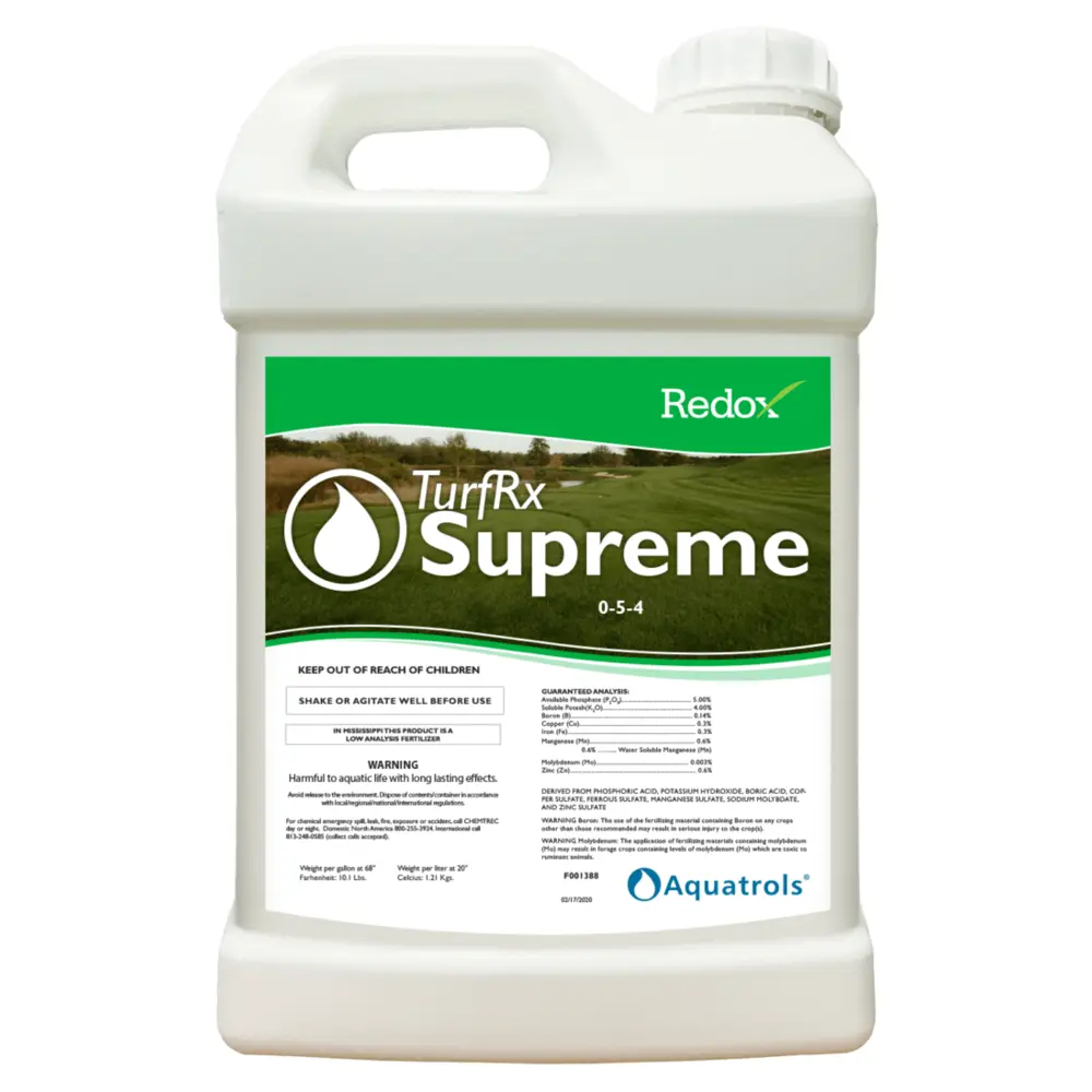 TurfRx Supreme is specifically formulated to target plant sugar alcohol production related to nitrogen metabolism in plants. The combination of plant nutrients and increased sugar alcohols will enhance nitrogen metabolism and improve overall quality and performance. Guaranteed analysis: - 5% Available Phosphate - 4% Soluble Potash - 0.14% Boron - 0.3% Copper - 0.3% Iron - 0.6% Manganese - 0.005% Molybdenum - 0.6% Zinc