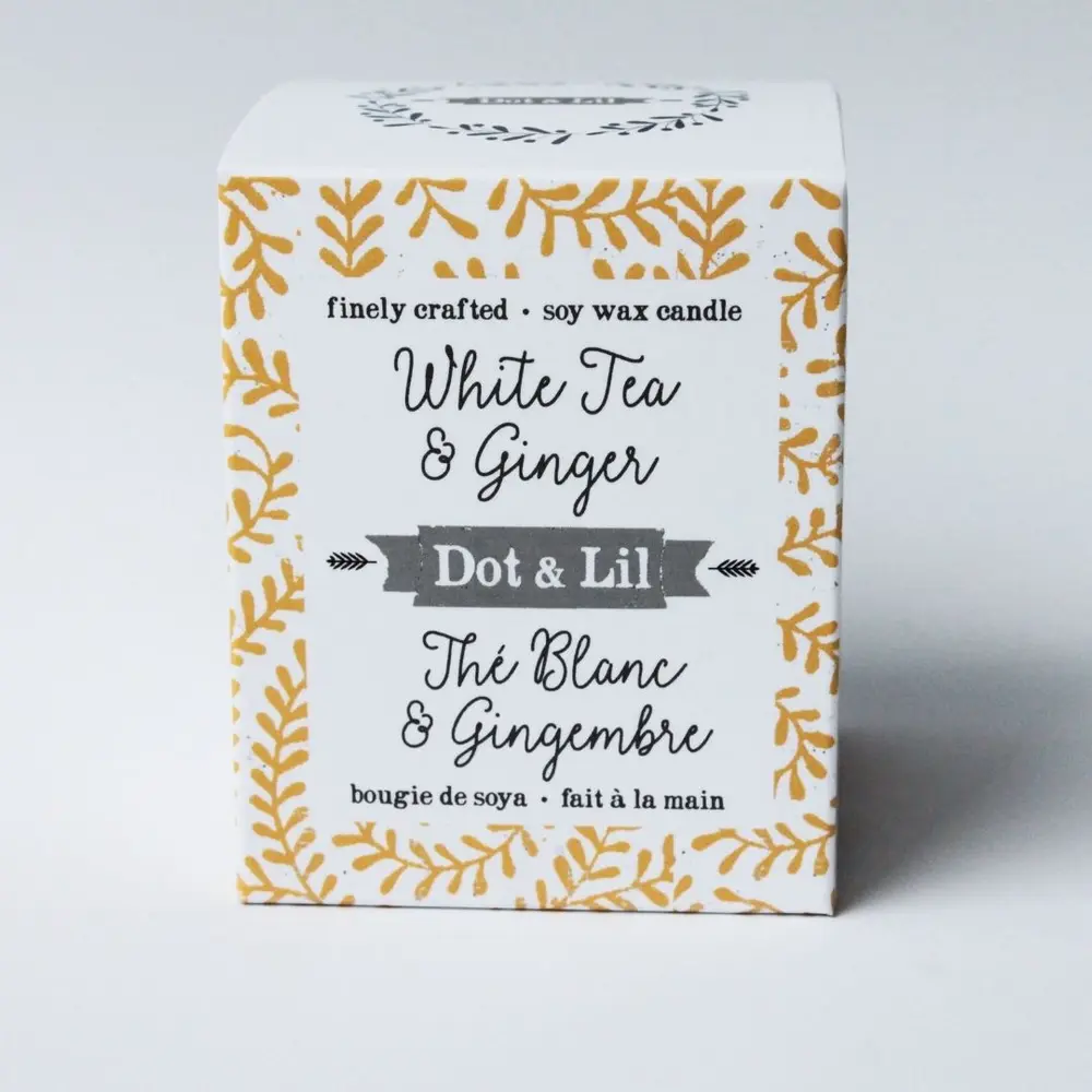 Dot & Lil?s finely hand-poured candles are made with a wax blend of 100% pure soy & botanical oils, with a cotton wick. Each candle is hand-poured in a glass jar with white metal lid, and comes with beautiful patterned box. This 7.2 oz size burns for approximately 45 hours.